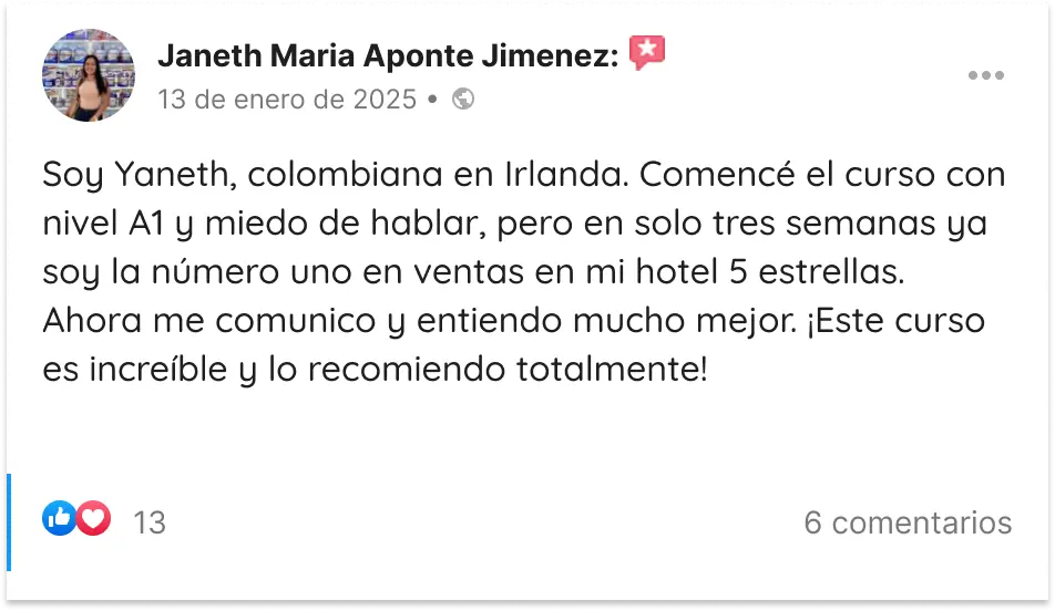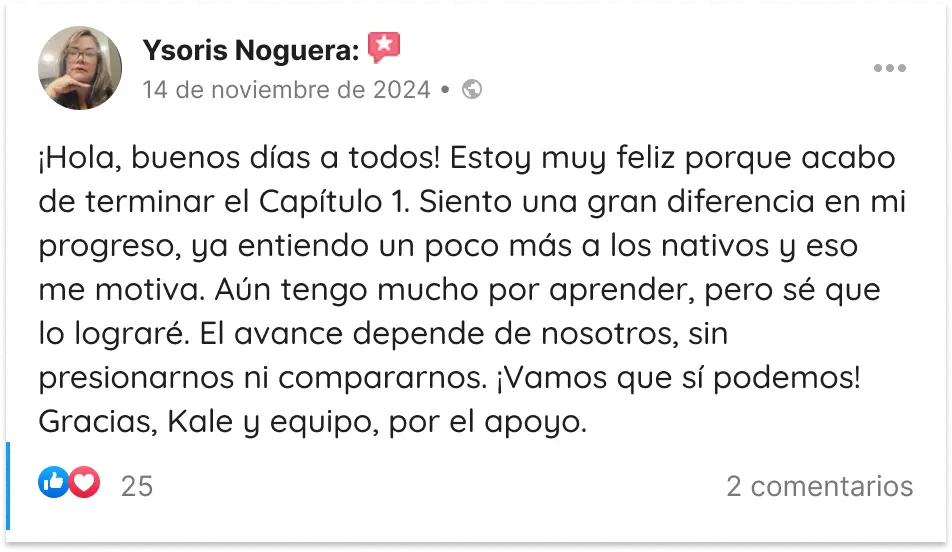 Este es el único curso 100% garantizado y con cero riesgos para aprender inglés. Te daré acceso de por vida a todo el contenido para que avances a tu propio ritmo y soporte 24/7 por si necesitas asistencia en cualquier momento.